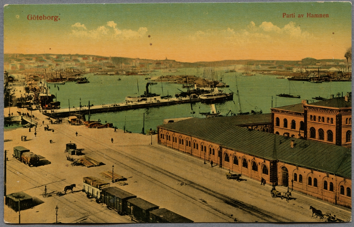 Parti av Göteborgs hamn med stenpiren och gamla tullhuset.
