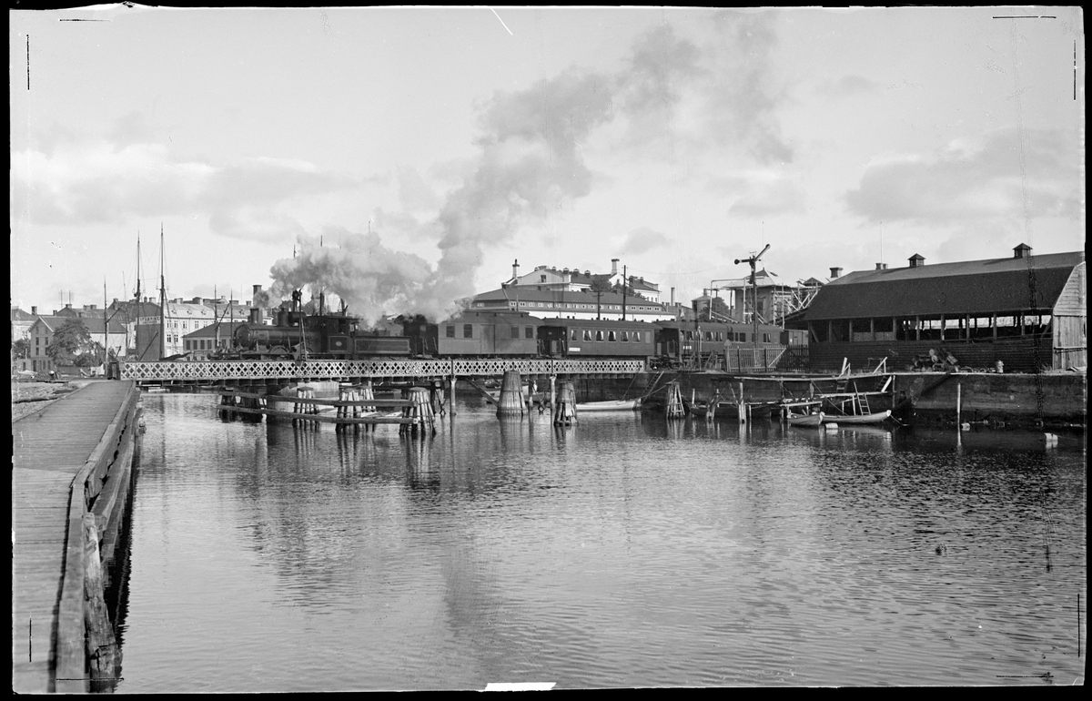 Uddevalla - Vänersborg - Herrljunga Järnväg, UWHJ lok 13 med personvagnar passerar den gamla svängbron vid järnvägsstationen i Vänersborg.