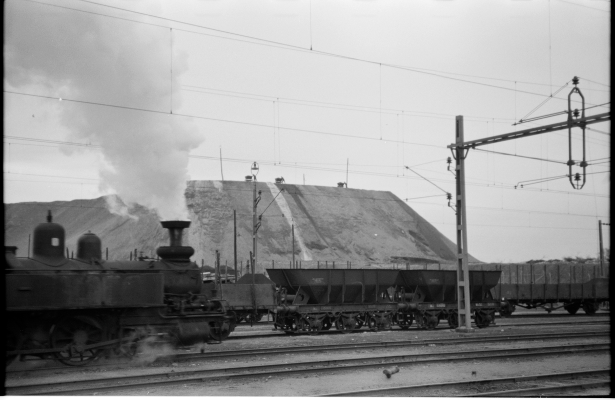 Ånglok och godsvagnar på bangård.