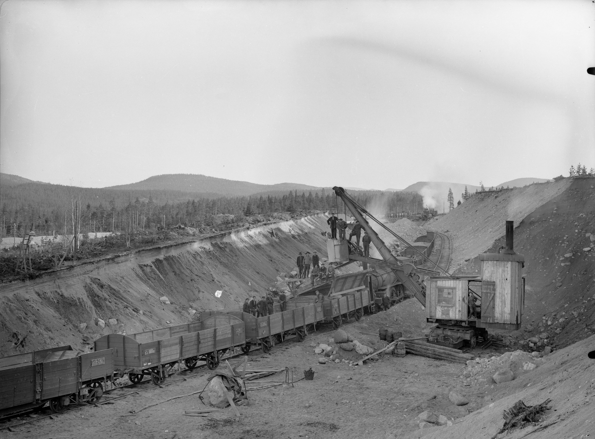 Grävmaskin och tåg i grusgrop