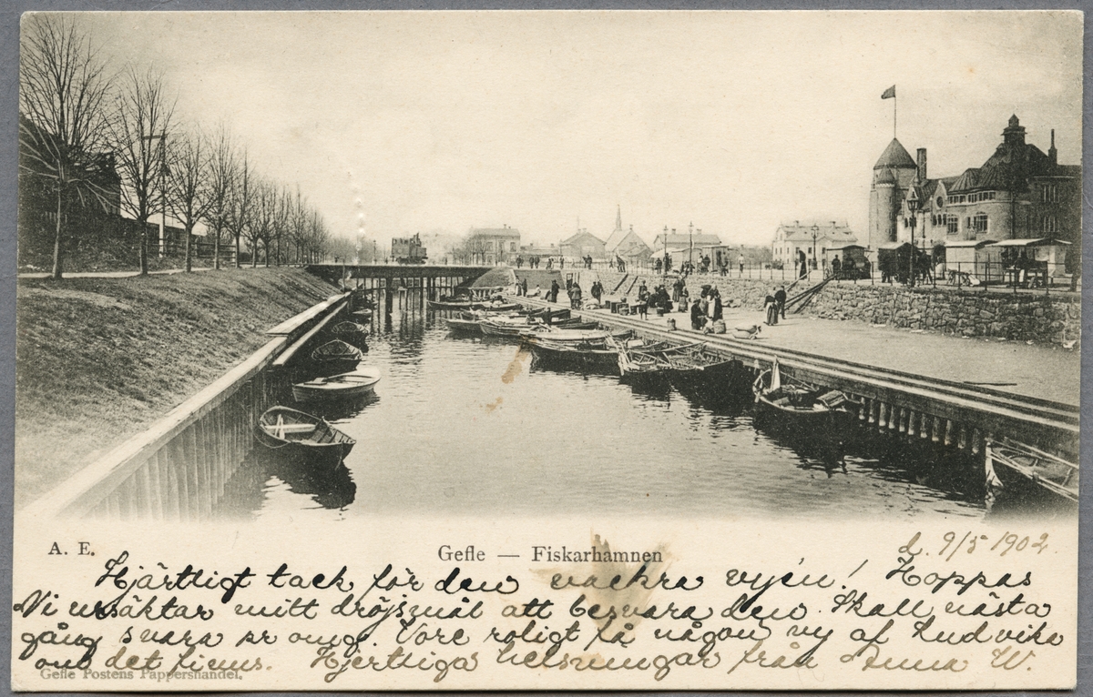 Fiskarhamnen i Gävle. Järnvägsstationen till vänster och brandstationen till höger.