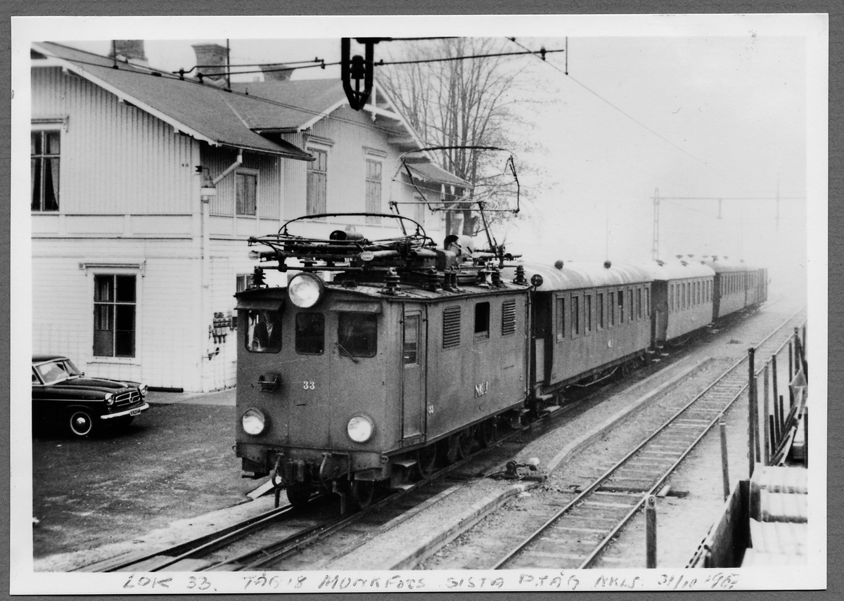 Nordmark-Klarälvens Järnvägar, NKlJ ellok 33 med persontåg vid Munkfors station.