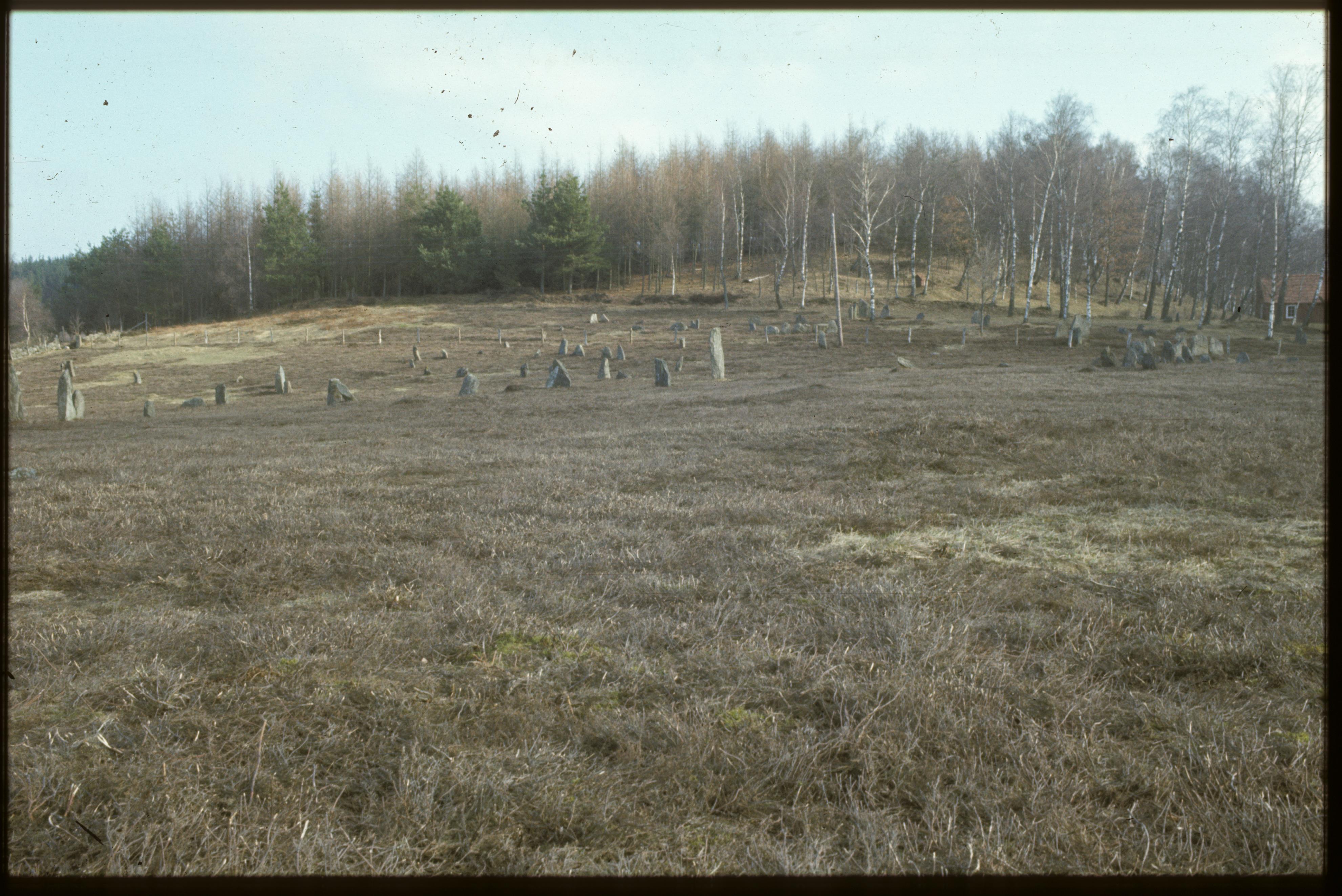 Norra Mellby 1:1. Gravfält, 250x150 m (SV-NÖ), bestående av ca 200 fornlämningar. Dessa utgöres av 15 skeppssättningar, 2 rektangulära stenkretsar och ca 183 resta stenar.