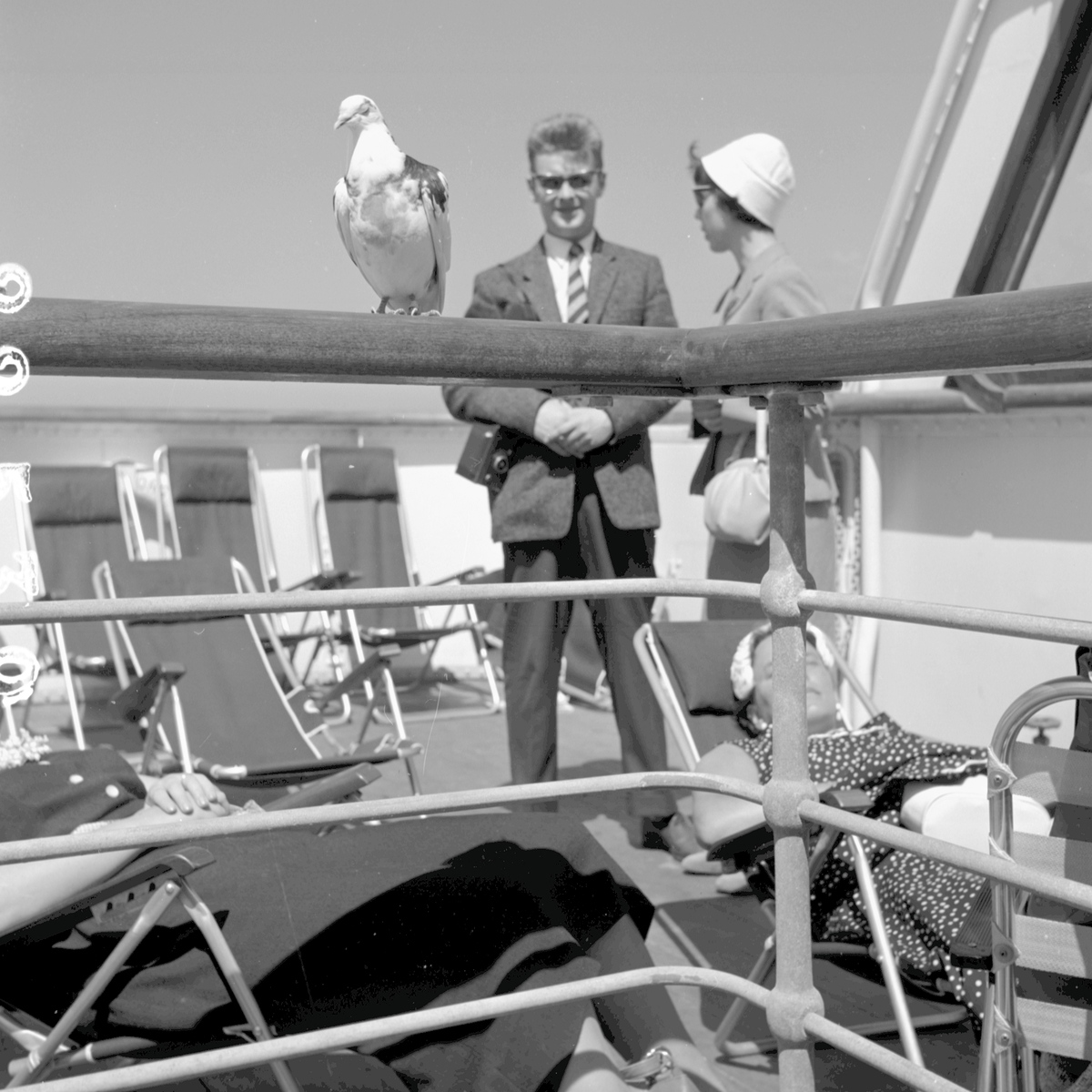 M/S Trelleborg, resande i vilstolar på soldäck, duva på reling