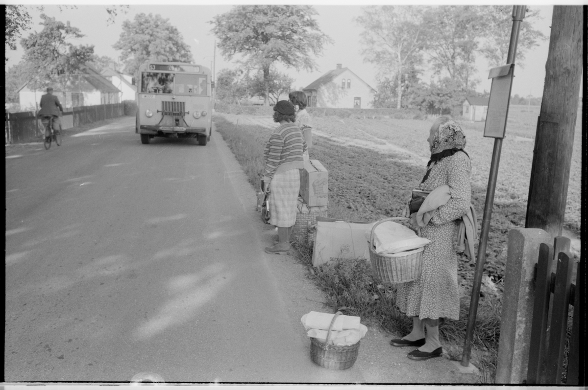 Resande vid busshållplats. Statens Järnvägar, SJ-buss.