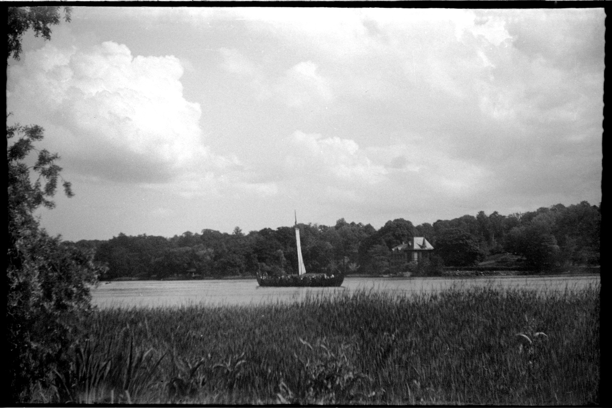 En båt med hissat segel i vikingastil med passagerare ute på vattnet.