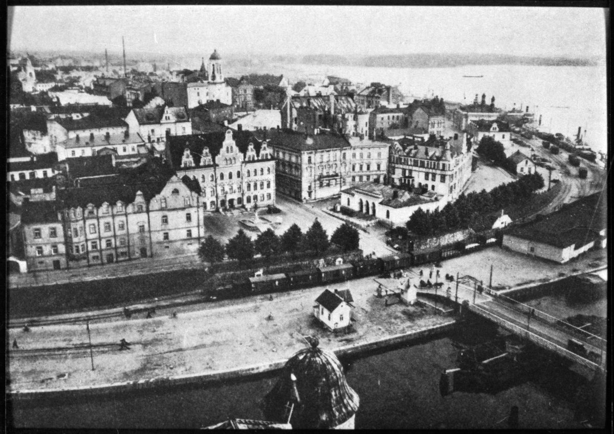 Vy över Viborg sett från slottstornet. Järnvägens hamnspår med spårvägens korsning syns. Bilden är tagen under tiden då Viborg var finskt.