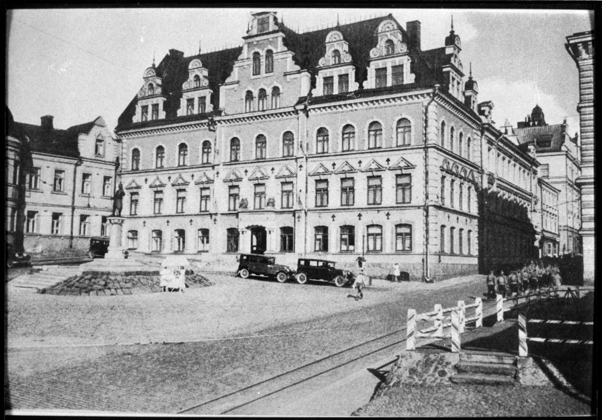 Rådhuset i Viborg. Spårvägen i nederkanten av bilden går mot Åbobro, kurvan på torget tillhör vändslingan för linje 1. Bilden är tagen under tiden då Viborg var finskt.