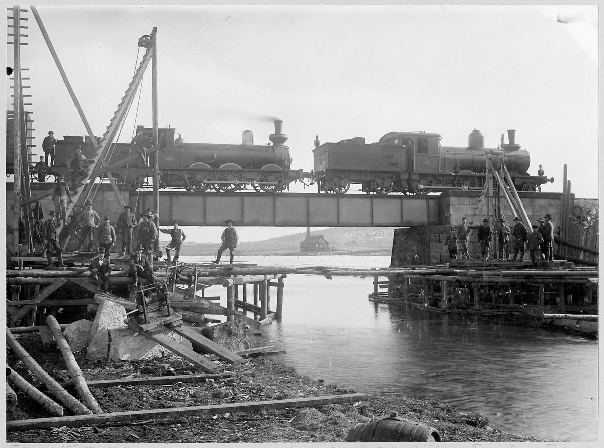 Uppförande av järnvägsbro Över Falunån. Gävle Dala Järnväg GDJ B 18, "Korsnäs" och GDJ F/L 36, "Hofors".