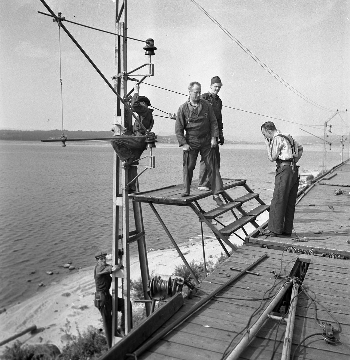 Elektrifiering av linjen Ånge-Sundsvall. Monteringsarbeten. Montagevagn vid stolpe med viktavspänning.