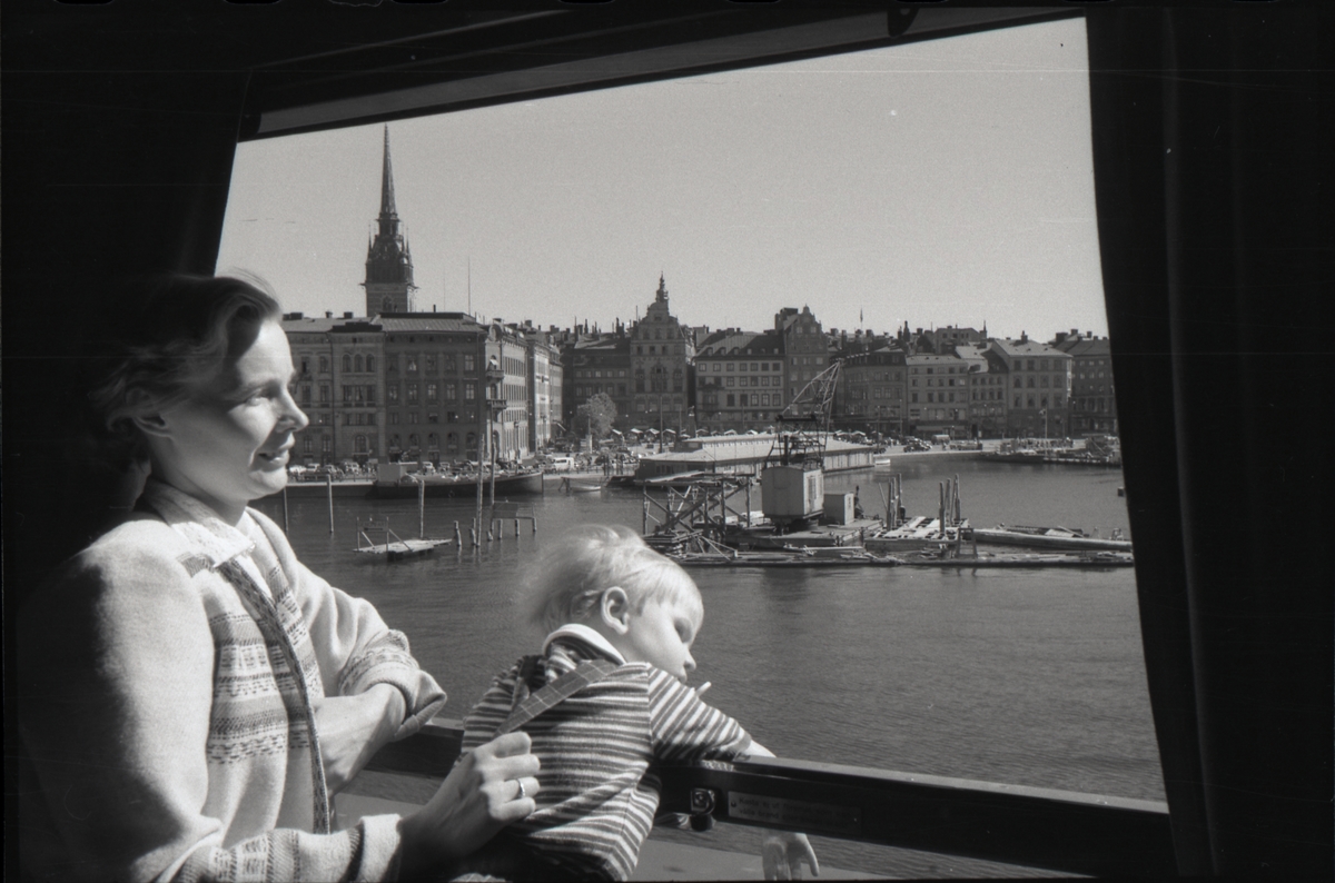 Kvinna med barn som tittar ut genom kupé fönster under resa på Södra Järnvägsbron, på sträckan mellan Riddarholmen och Mälarstrand. Tyska Kyrkans torn i bildens vänstra del.