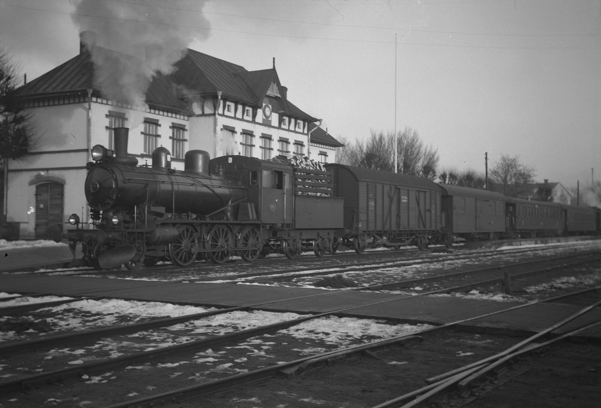 Nässjö - Oskarshamns Järnväg, NOJ lok 25, med vagnarna cykelvagn NOJ F6, resgodsvagn NOJ F5, NOJ BCo 702 och NOJ BCo 763 en stålvagn.