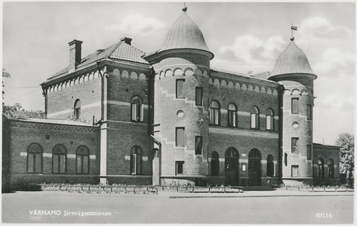 Värnamo station. Halmstad-Nässjö Järnväg, HNJ. Första stationshuset byggdes 1877 och revs 1995 för att det stod i vägen för en planerad vägkorsning. Första lokstallet byggdes 1875 men revs 1894 och ett nytt byggdes på annan plats på bangården. Ett nytt stationshus byggdes 1899 av Skånes-Smålands Järnväg, SSJ men byggnaden användes aldrig som järnvägsstation då SSj och HNJ enades om att använda HNJ station. 1902 byggdes ett nytt gemensamt stationshus vid godsmagasinet. 1903 anslöts Borås- Alvesta, BAJ hit och då byggdes ett nytt godsmagasin som bekostades av BAJ. Detta magasin tillbyggdes 1918 och 1935. HNJs gamla stationshus flyttades 1902 och blev bostads- och överliggningshus.