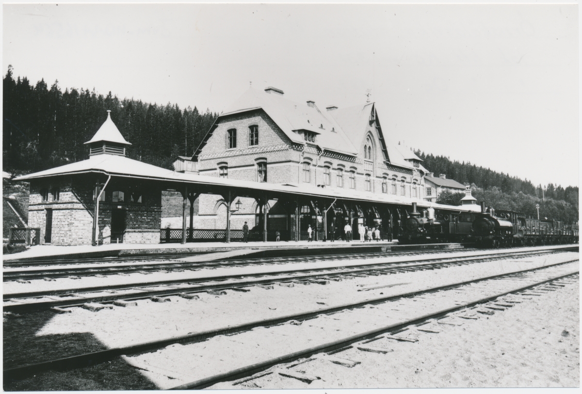 Örnsköldsviks station 1893, sedd från Öster. Ångloken är, Statens Järnvägar, SJ Kc 331 "Per" och Statens Järnvägar, SJ Oc 387.