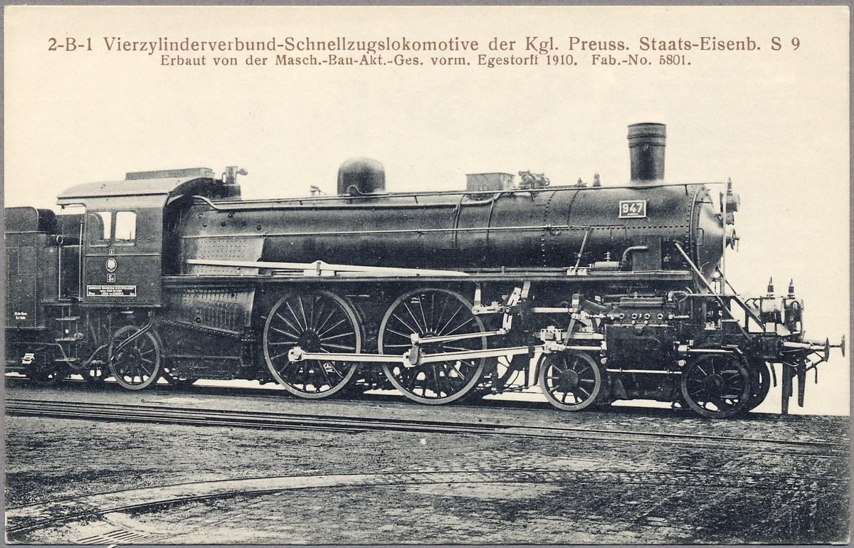 Ånglok Preußische Staatseisenbahnen S9 947. Lokets cylindrar är utrustade med ventiler system Lentz.