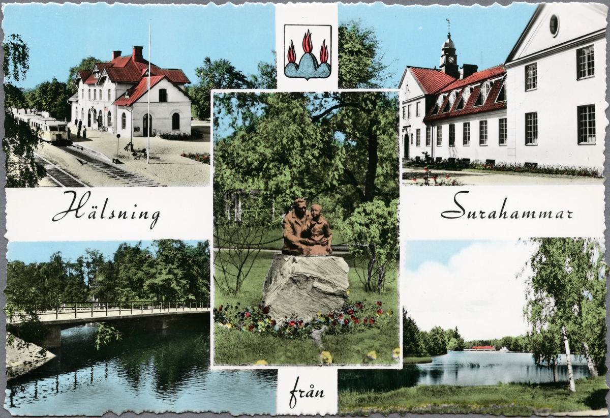 Vykort med vyer från Surahammar, däribland järnvägsstationen.