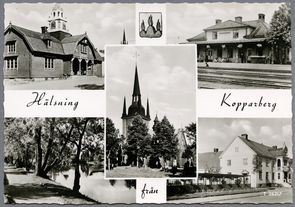 Bildkollage från Kopparberg med tingshus, station, naturområde och okänd byggnad i bild.
