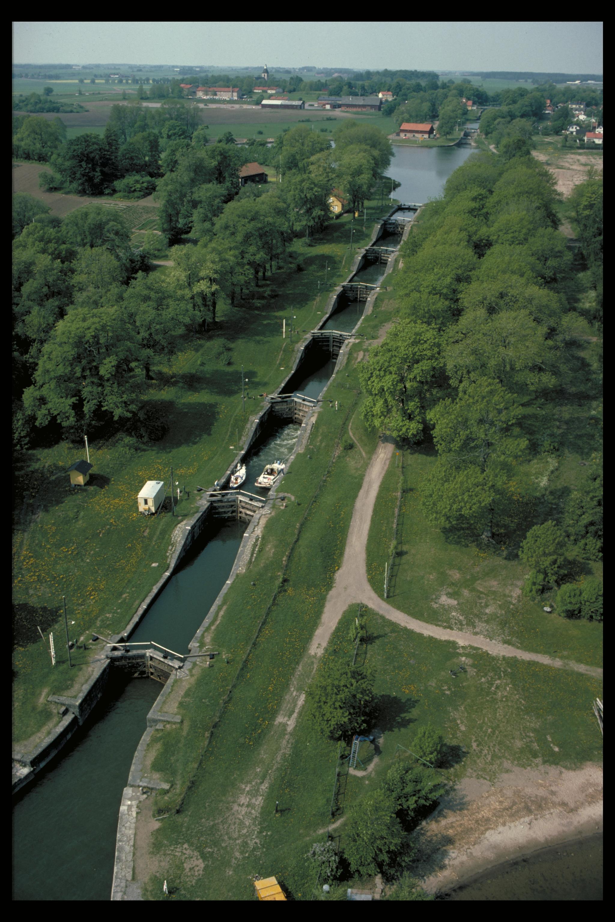 Slussar i Göta kanal. Bilden troligen från början av 1980-talet.