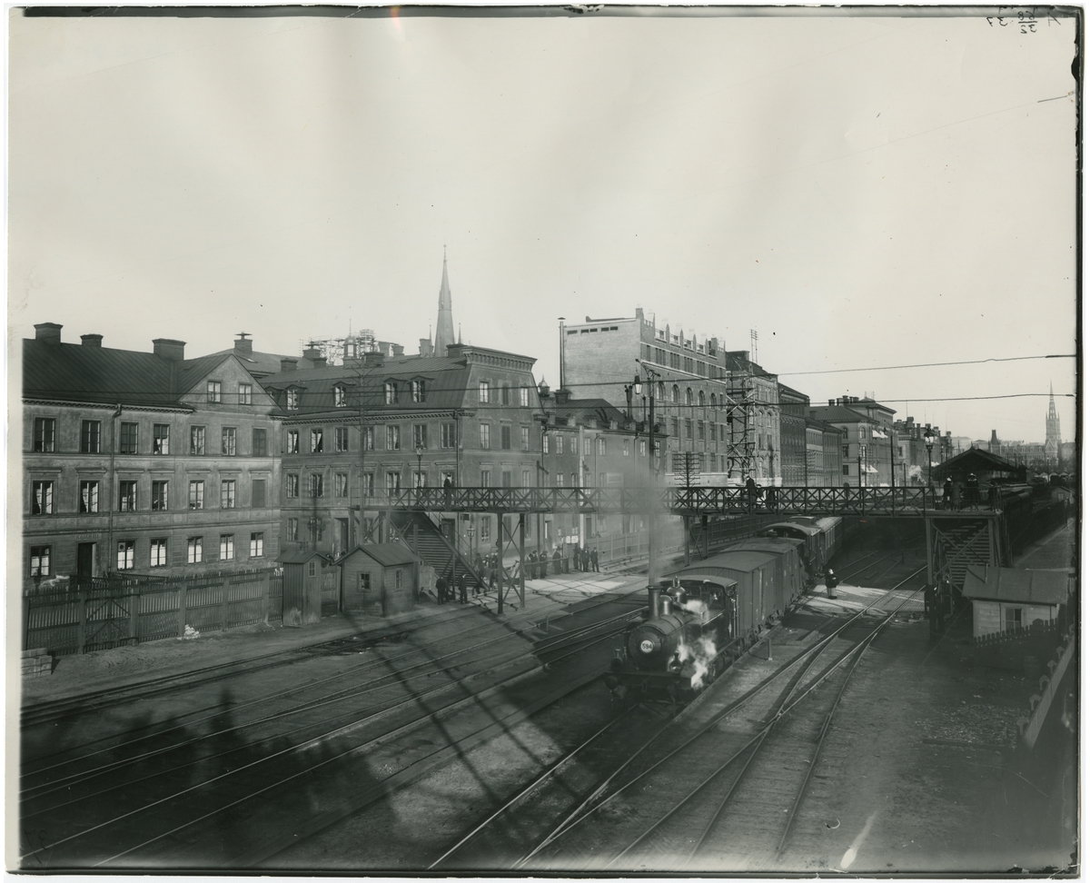 Statens Järnvägar, SJ U 594 med tåg vid järnvägsviadukten vid Gamla Kungsholmsbrogatan.