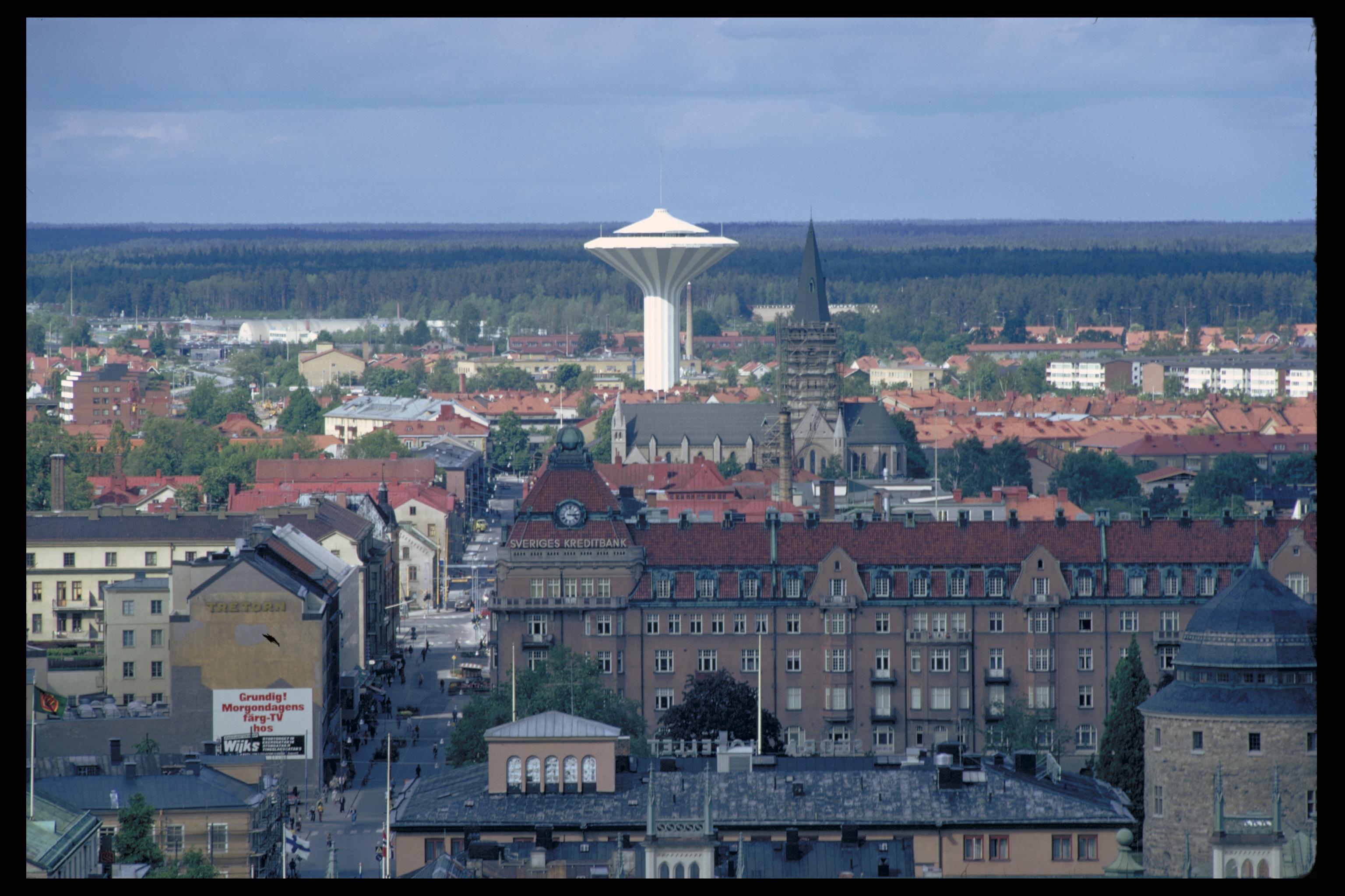 Stadsvy med vattentorn i bildens mitt. Bilden troligen från mitten av 1970-talet.