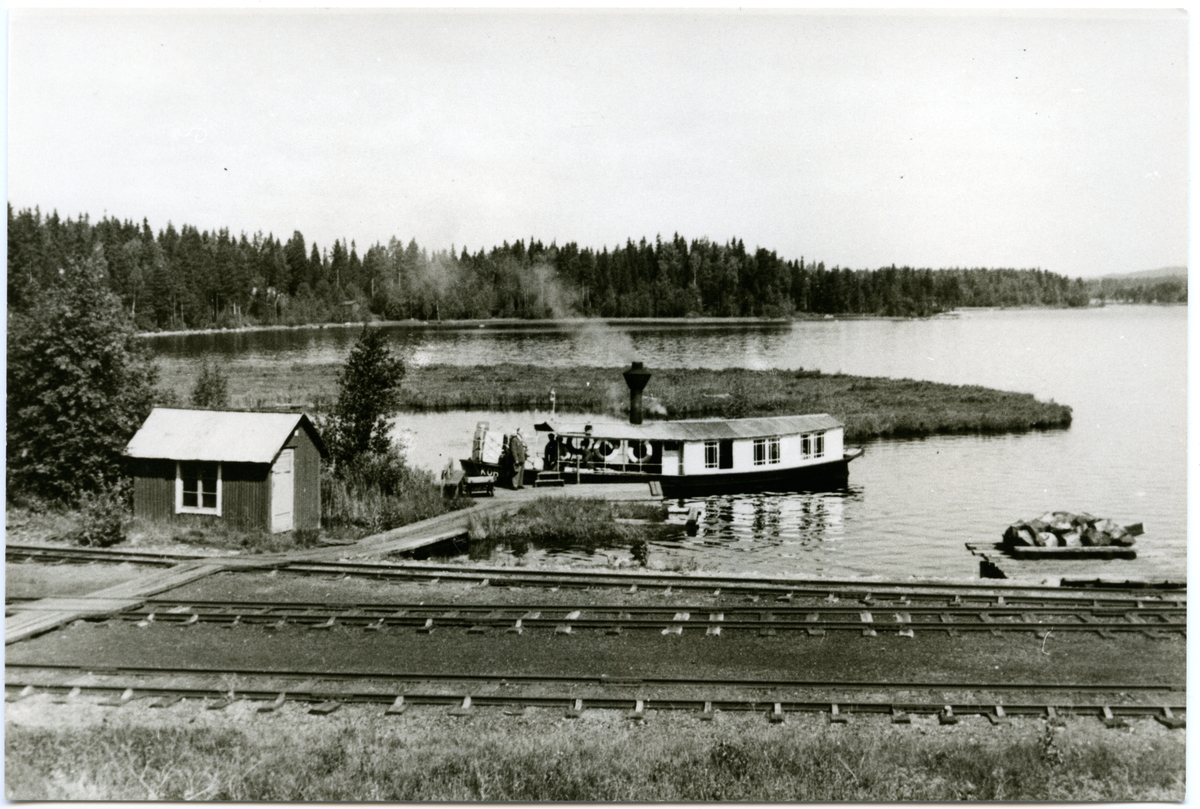 Ångbåtsbrygga med ångbåten Korså 1 vid Korsån station i södra änden av sjön Hyen, man kan se lastplatsens spår i förgrunden.