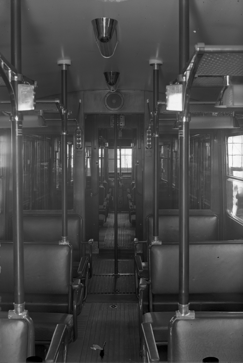 Interiör av rökkupé mot icke rökare. Manövervagn. Lidingöbanan, LiB, vagn 26. Lidingö Trafik AB.