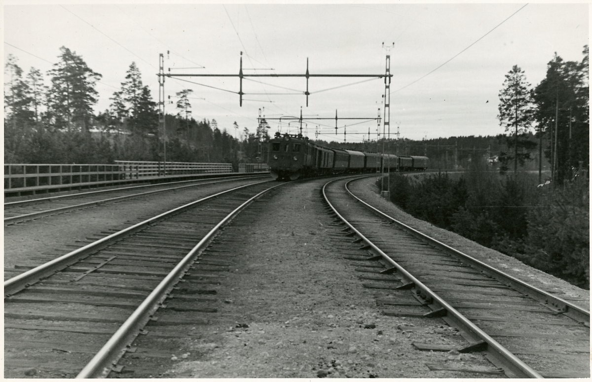 Persontåg vid Södertälje havsbad, på väg mot dåvarande Södertälje Södra station. Statens Järnvägar, SJ D. Det högra spåret är Norra Södermanlands Järnväg, NrSlJ.
