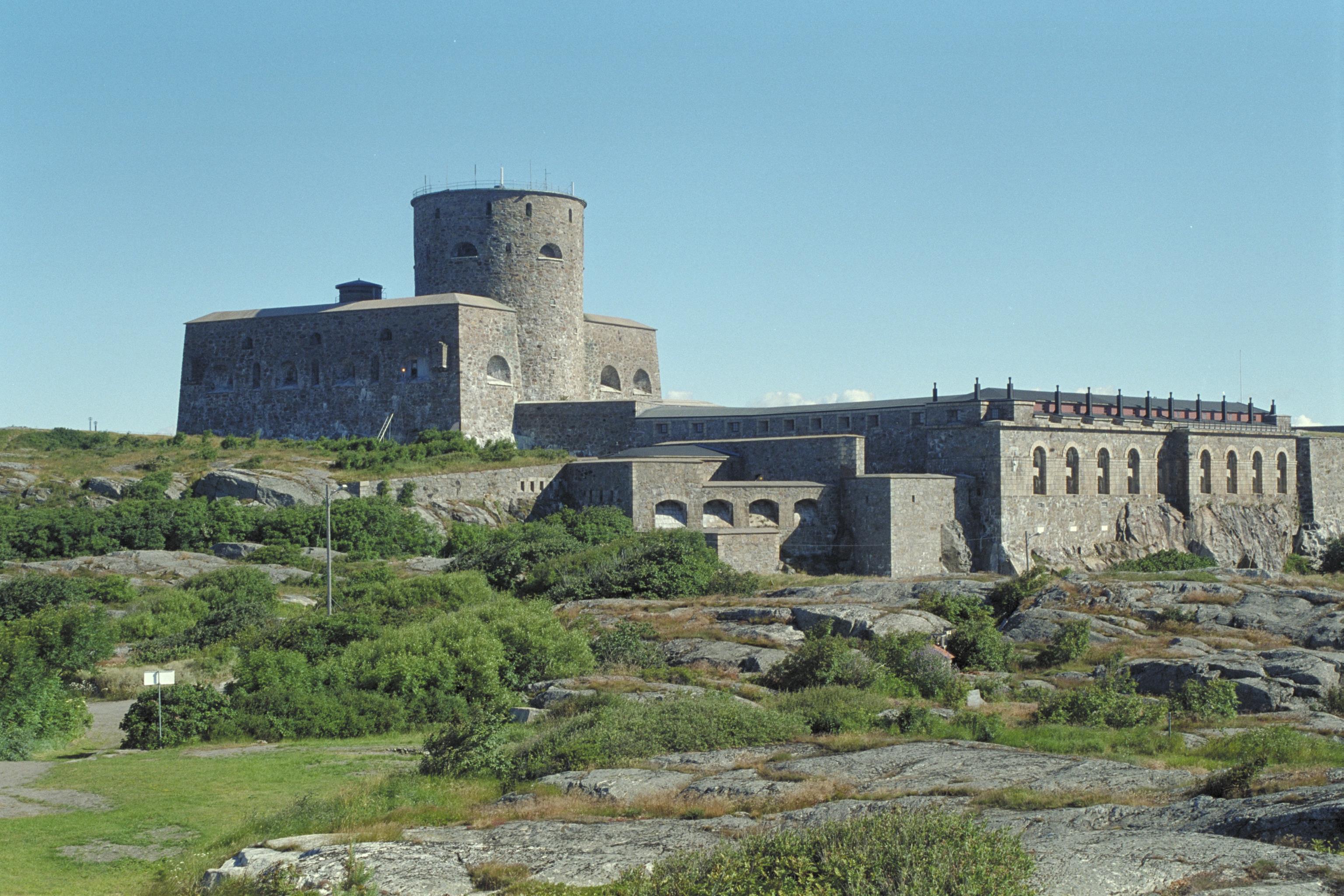 Carlstens fästning, sett från syd, sydväst. Fästningen började byggas 1658 och fick nuvarande utseende 1857. Kanske mest känd som ett fängelse, så var det dock ett av Sveriges starkaste befästningar mot danskarna.