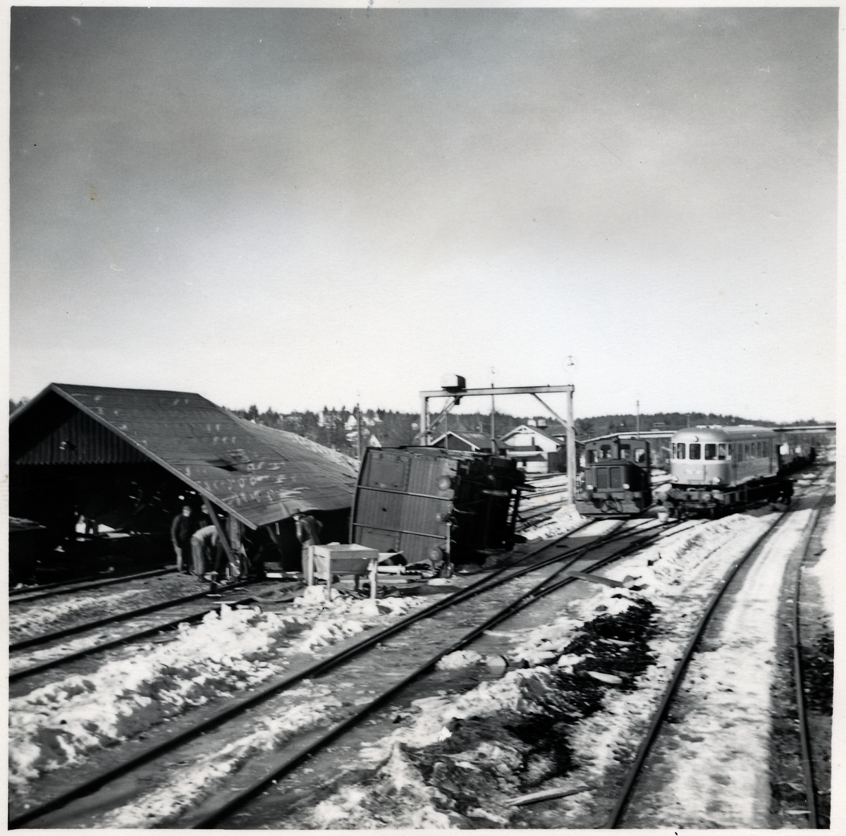 Omlastningsskjul rasar samman efter urspårning. Rälsbuss, Statens Järnvägar, SJ UCFo3yp 2113, SJ 100143 Q37.