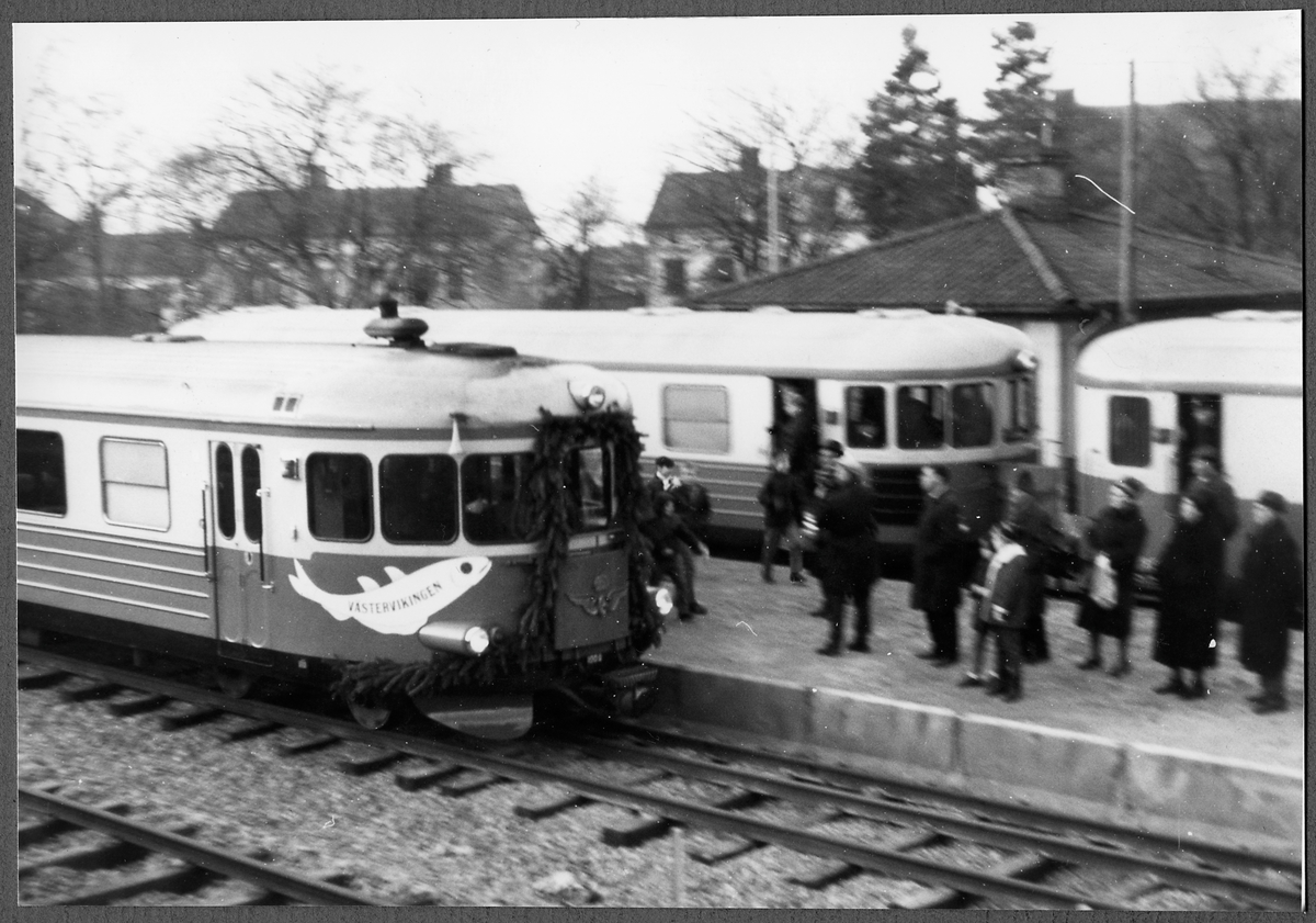 Invigningståget anländer Västervik med Statens Järnvägars Generaldirektör Erik Upmark.