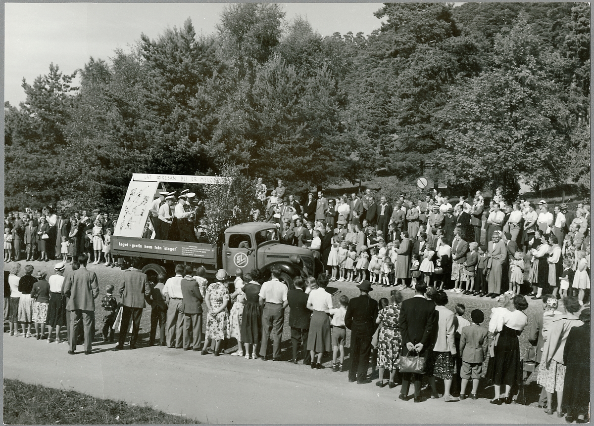 Svensk Lastbil AB, SLAB lastbil under Barnens Dag i Södertälje med ett musikband på flaket.