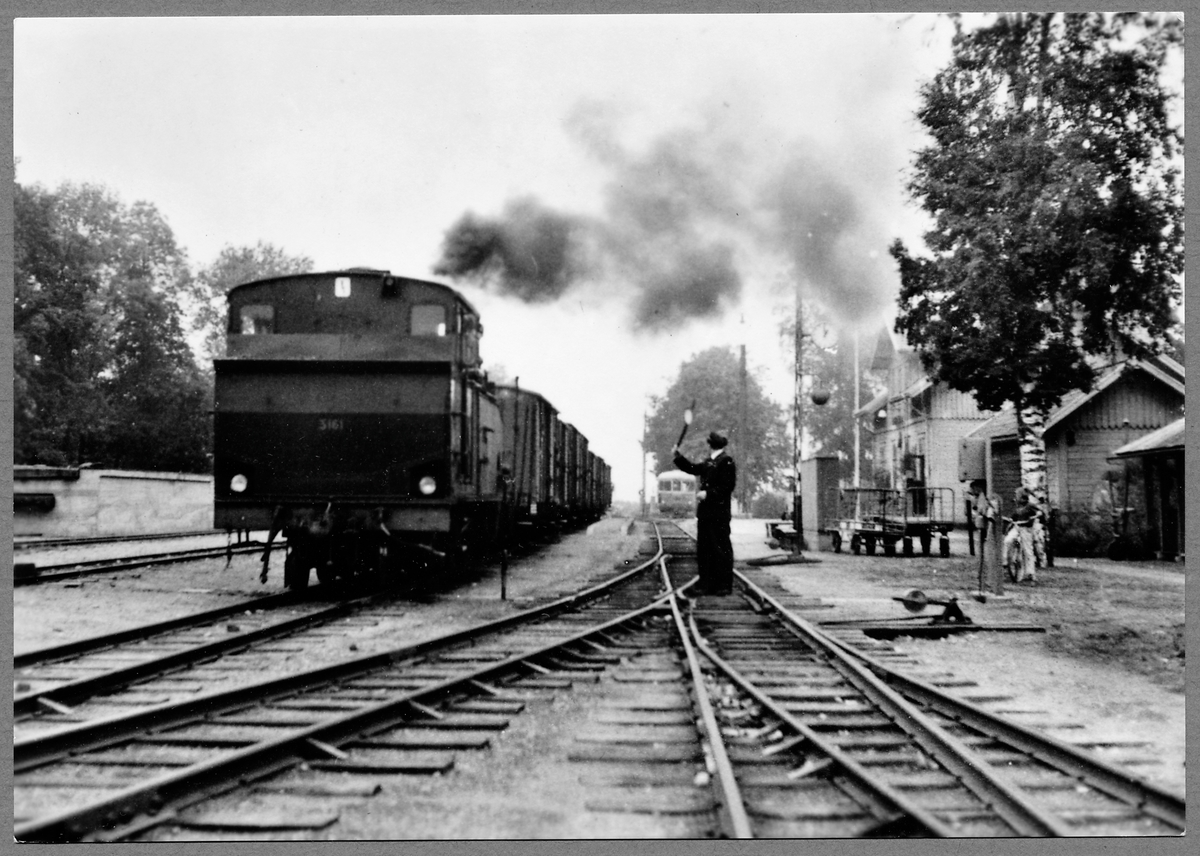 Godståg vid Vadstena station. Statens Järnvägar, SJ N4p 3161. Tågklarerare är Rune Hägerström.