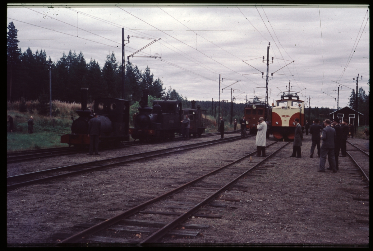 Ånglok och ellok vid Nordmark station. Däribland NKlJ lok 1 "UA", NKlJ lok 5 "Lovisa Tranaea", NKlJ ellok 41 samt NKlj ellok 101 "Hagfors". Nordmark–Klarälvens Järnvägar.