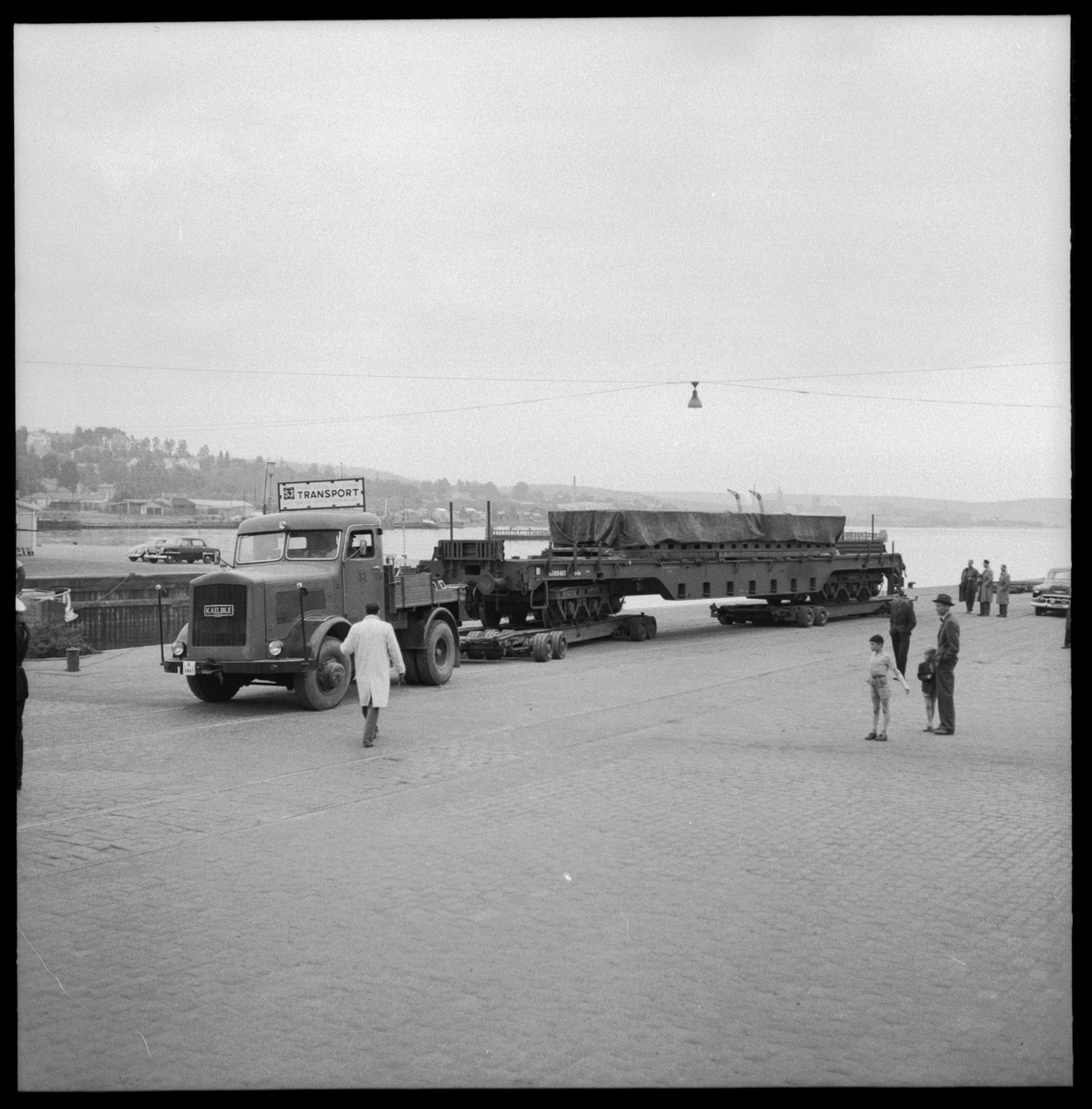 Statens Järnvägar, SJ Sdu 100403. Specialtransport med vagnbjörn. Fundament för slipmaskin till Ortviken pappersbruk