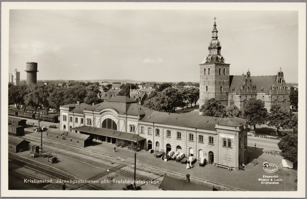 Vy över Kristianstad centralstation och Trefaldighetskyrkan.