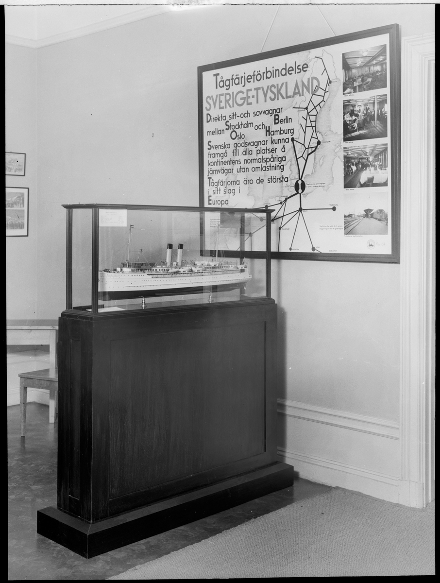 Titel: Foto av interiör med monter och tågfärjemodell.