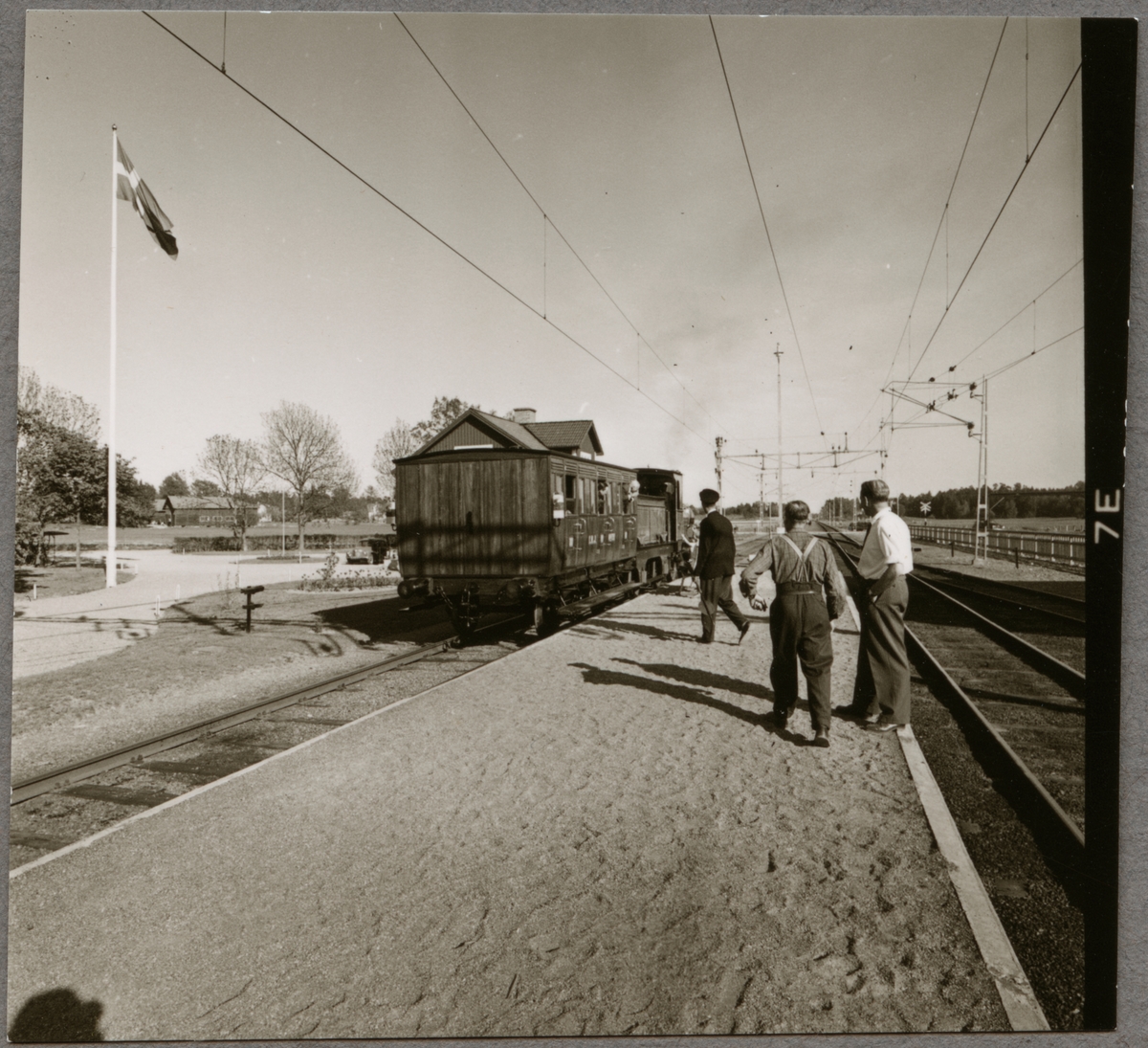 Från Trafikaktiebolaget Grängesberg - Oxelösunds Järnvägar, TGOJ:s styrelseresa maj 1956. Oxelösund - Flen - Västmanlands Järnväg, OFWJ A 8 är loket med personvagnen Köping - Hults Järnväg, KHJ C 35.