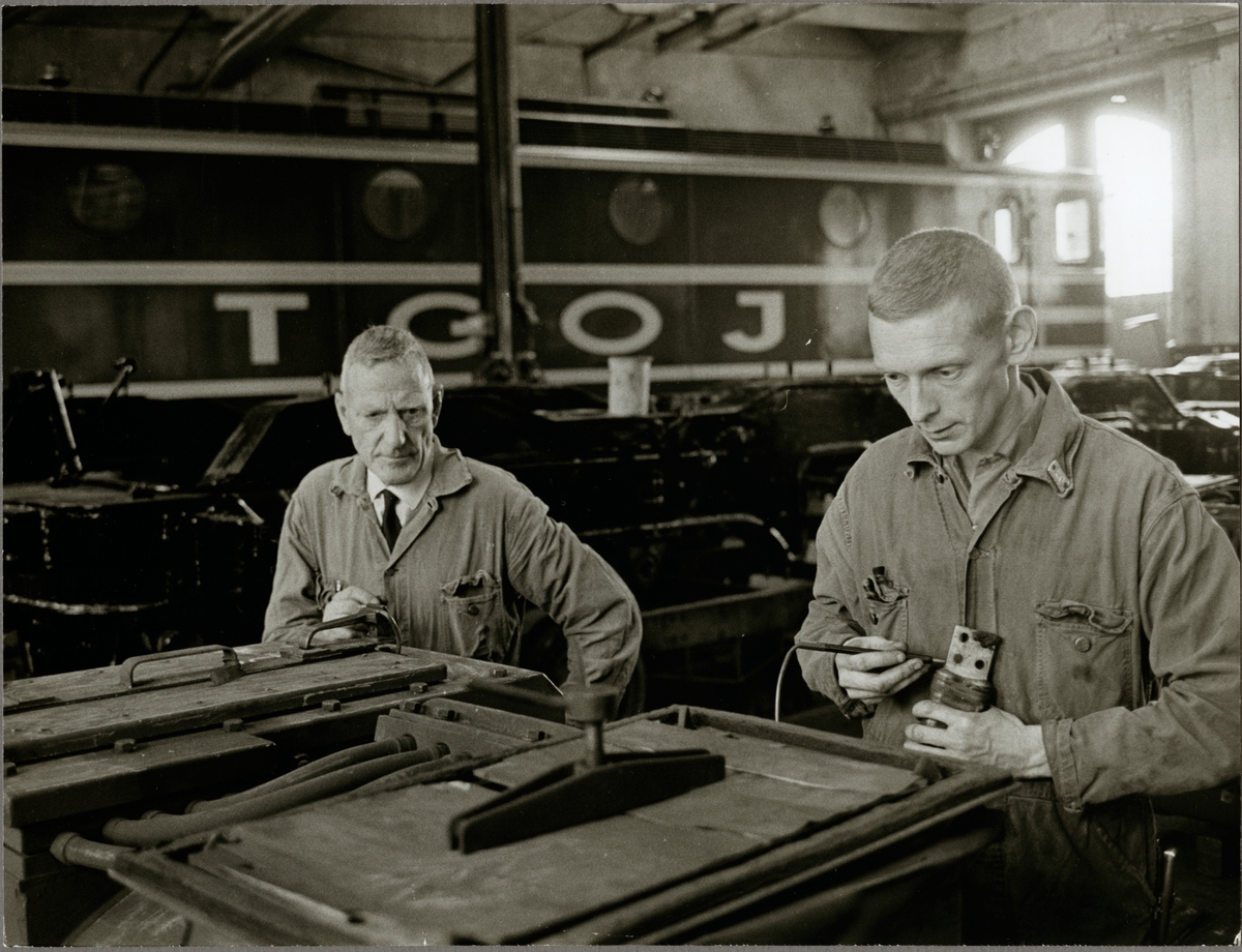 Mätning av resistanser i traktionsmotor. Trafikaktiebolaget Grängesberg – Oxelösunds Järnvägar, TGOJ Ma 407 i bakgrunden.
