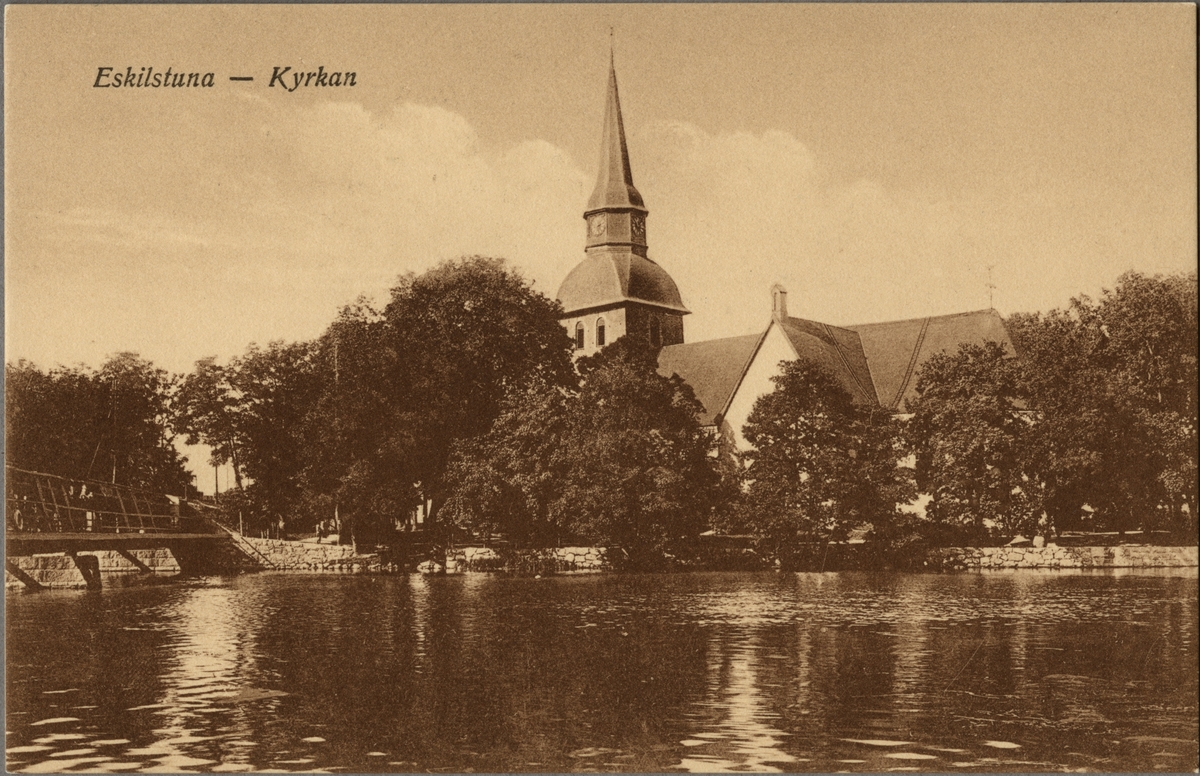 Vy över Fors kyrka i Eskilstuna, till vänster järnvägsbron över Eskilstunaån på linjen mellan Eskilstuna C och Härad.