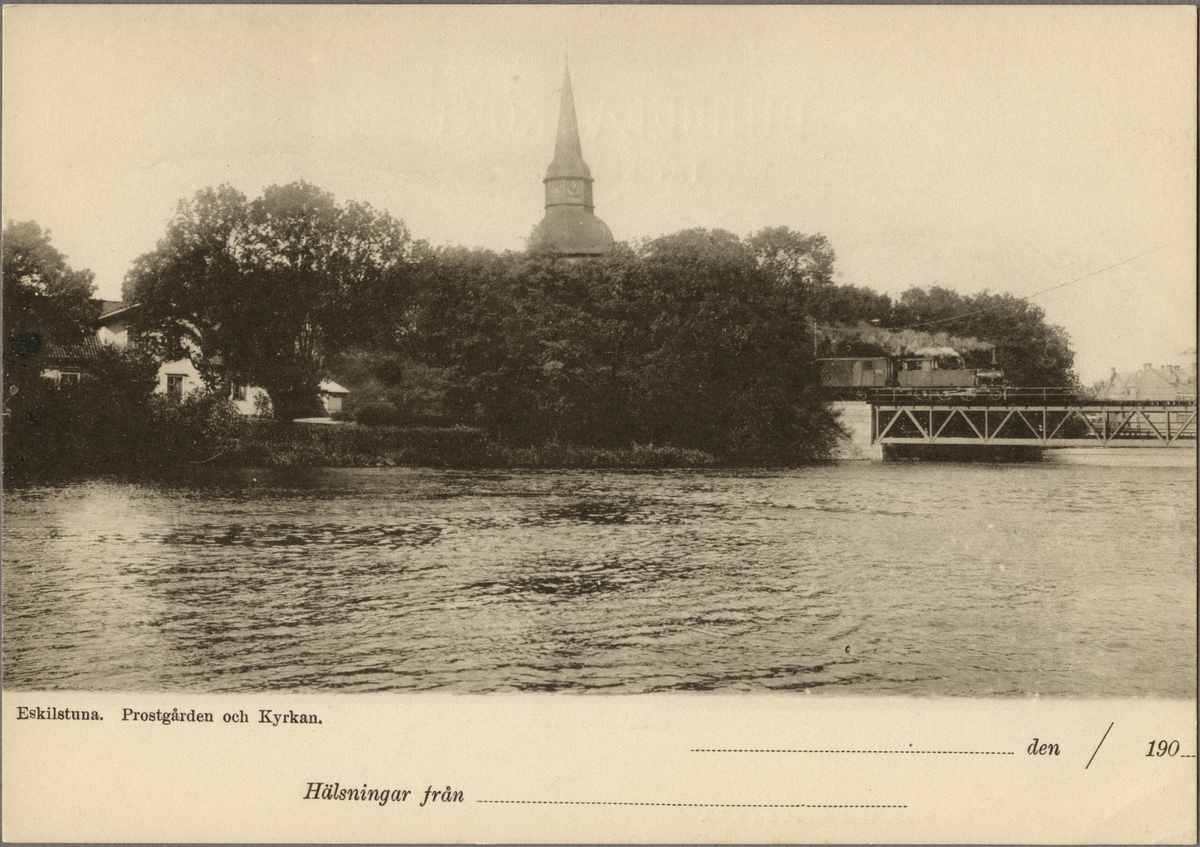 Vy över järnvägsbro över Eskilstunaån med Fors Kyrka i bakgrunden. På linjen mellan Eskilstuna C och Härad.