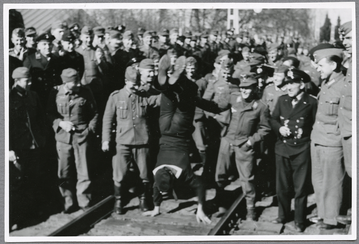 Sjöman står på händer med tyska permittenter runt omkring.