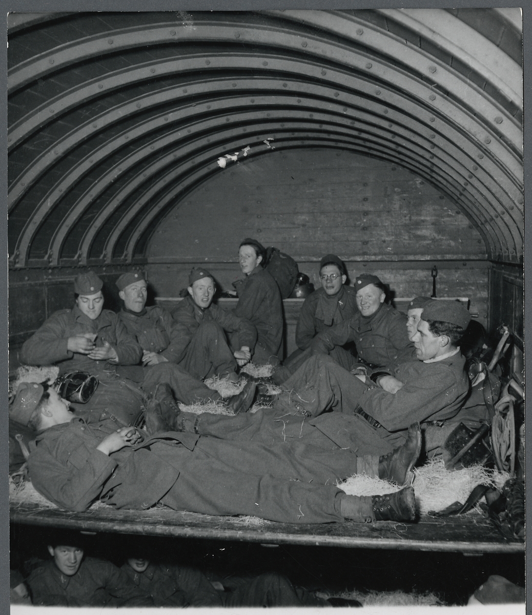 Titel: Militärtransport på linjen mellan Nässjö - Falköping. Ombyggd godsvagn för husering av soldater.