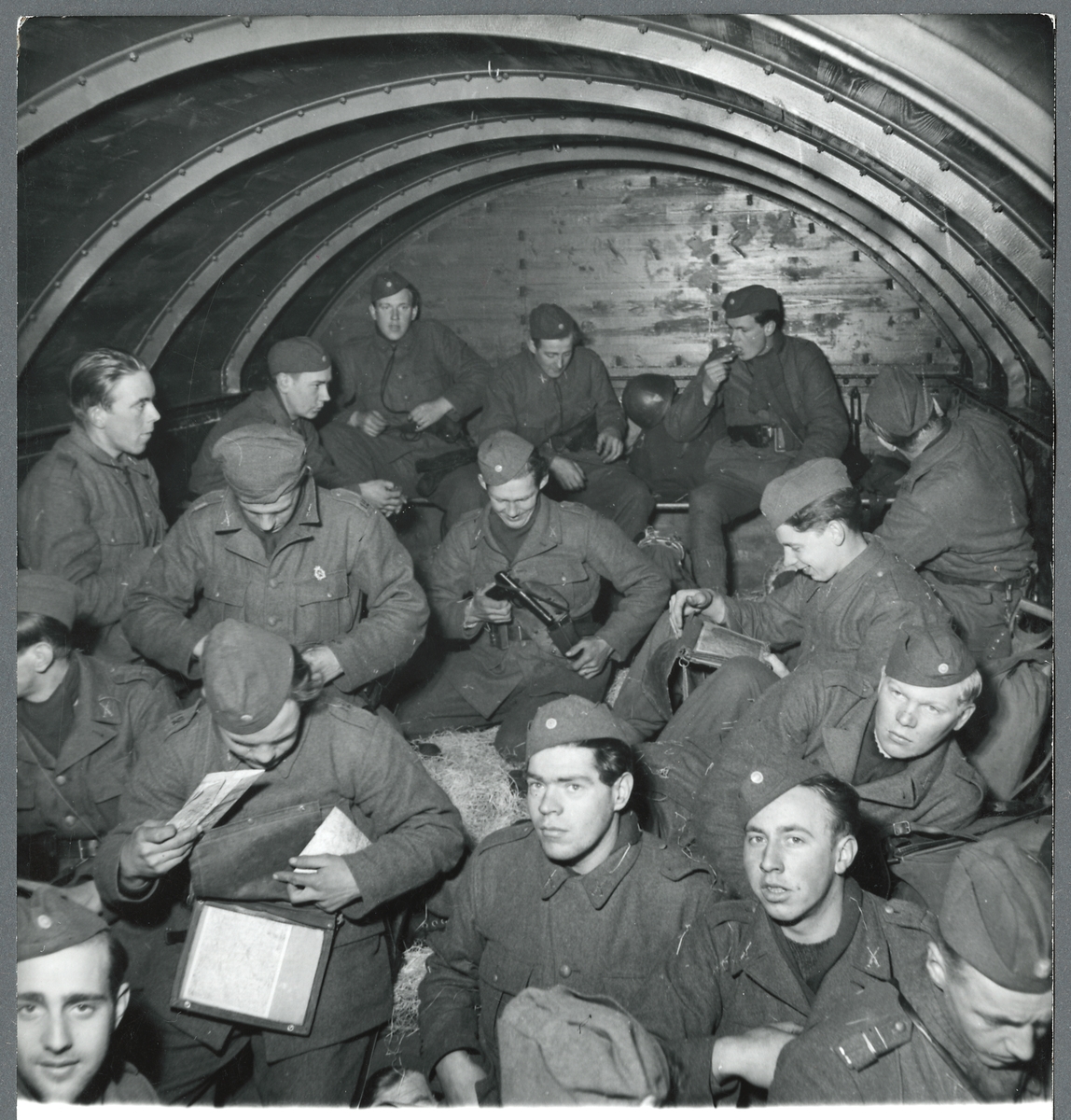 Titel: Militärtransport på linjen mellan Nässjö - Falköping. Ombyggd godsvagn för husering av soldater.