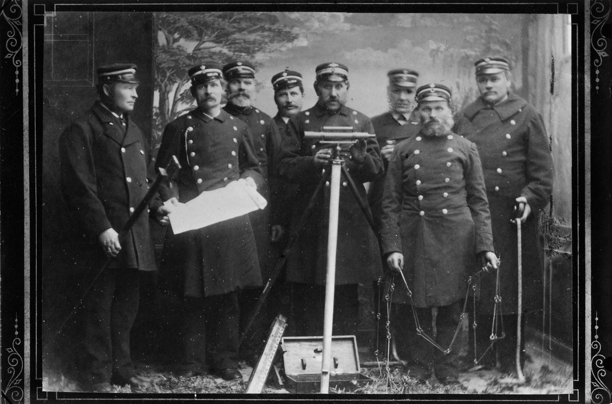 Titel: Gruppfoto av Banmästare med sina arbetsredskap.