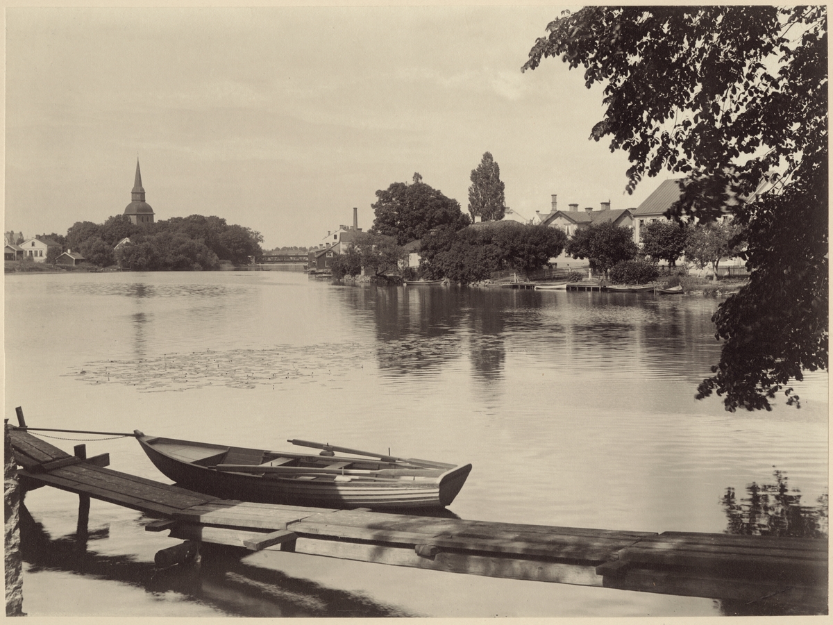 Vy över Eskilstunaån med Fors kyrka och järnvägsbron i bakgrunden.