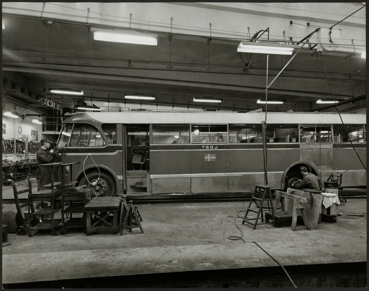 En Trafikaktiebolaget Grängesberg - Oxelösunds Järnvägar, TGOJ buss i en verkstad.