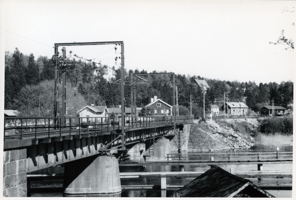Titel: Svängbara järnvägsbron vid Stäket efter elektrifiering, på sträckan mellan Stäket och Kungsängen.
