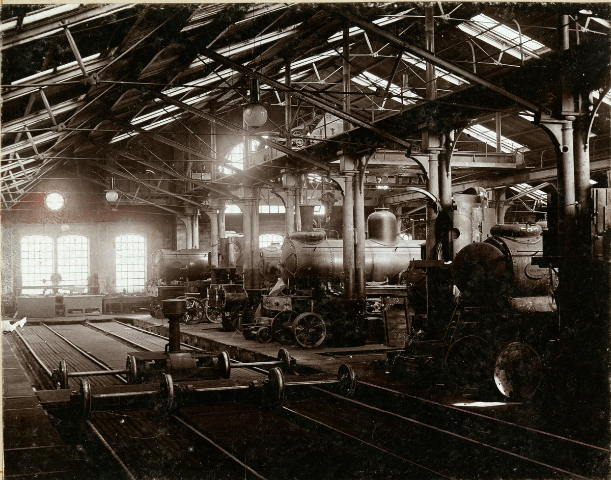 Huvudverkstaden vid Malmö station. Interiör av lokverkstaden. De två närmaste loken är Statens Järnvägar, SJ Kd 522 samt samt SJ Cc 418.