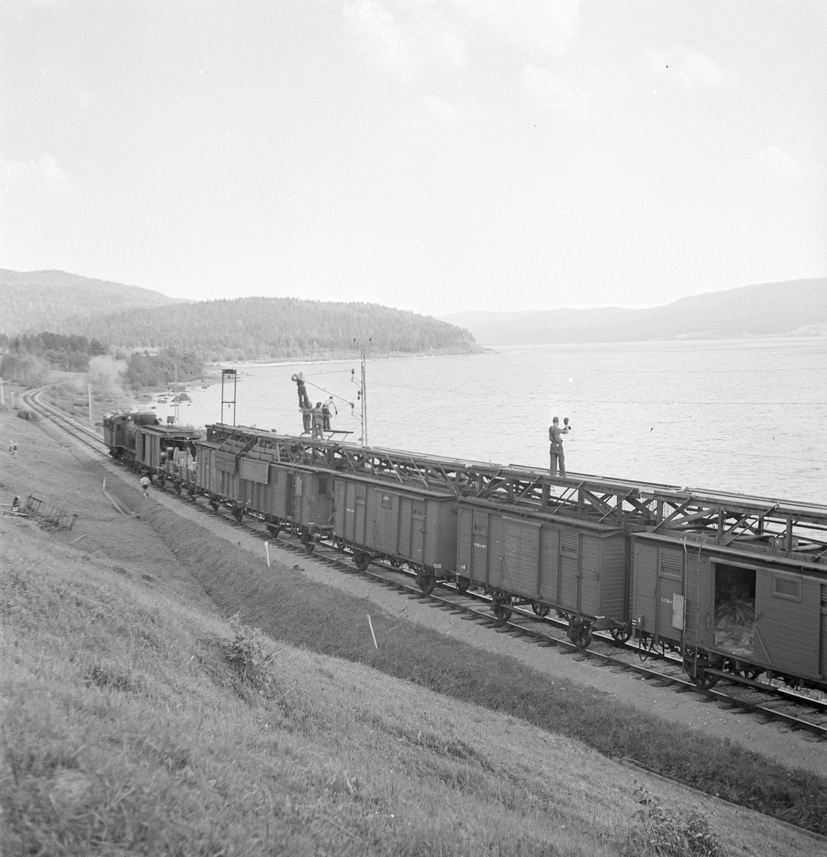 Elektrifiering av linjen Ånge-Sundsvall. Montering av kontaktledning pågår och bilden visar elrevisionståget vid arbetet längs Stödesjön. En bit bortanför udden ligger Nedansjö.