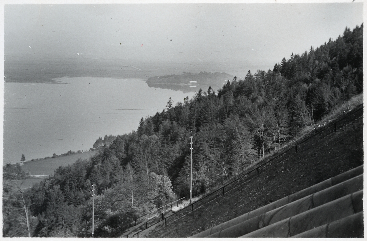 Utsikt från bergbana vid vattenkraftverket Walchensee.